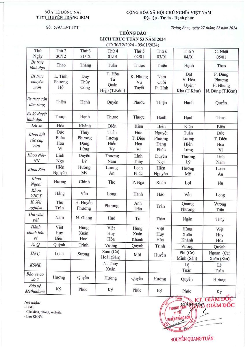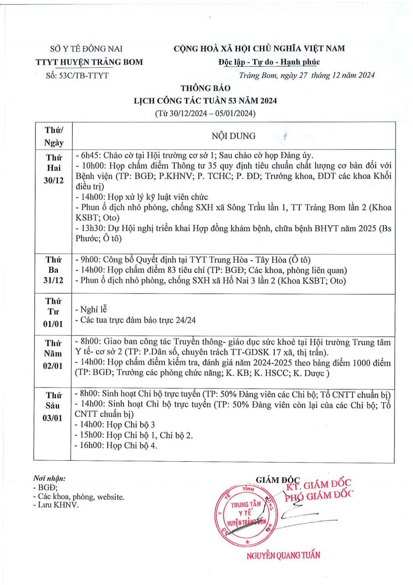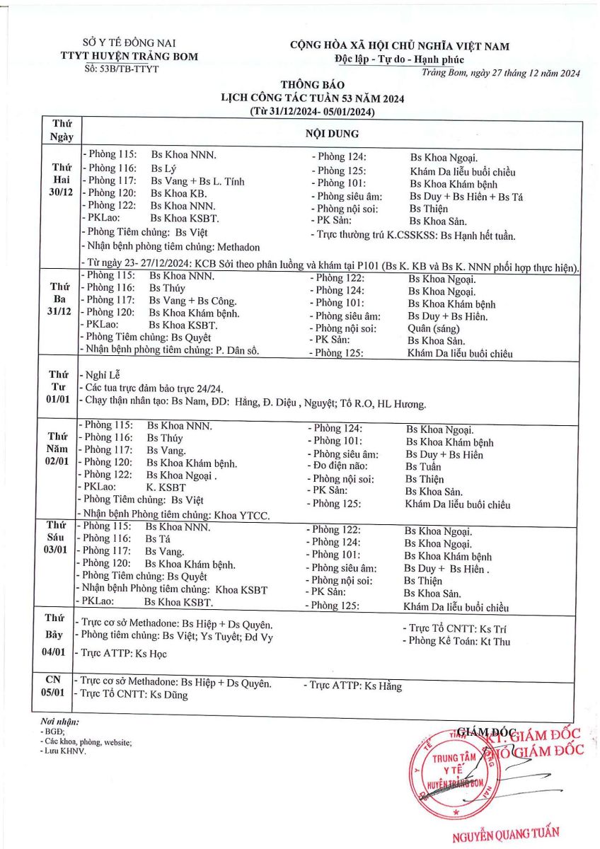 Lịch trực - công tác tuần 1 năm 2025