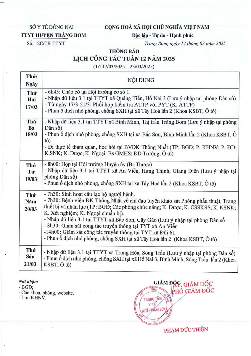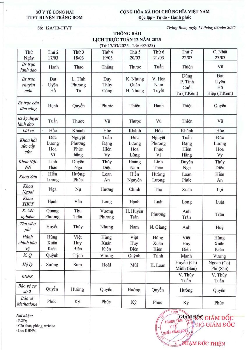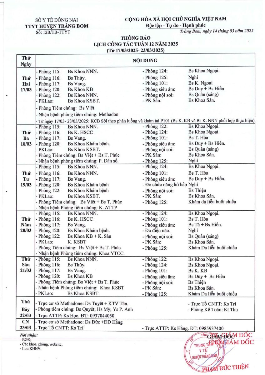 Lịch trực - công tác tuần 12 năm 2025