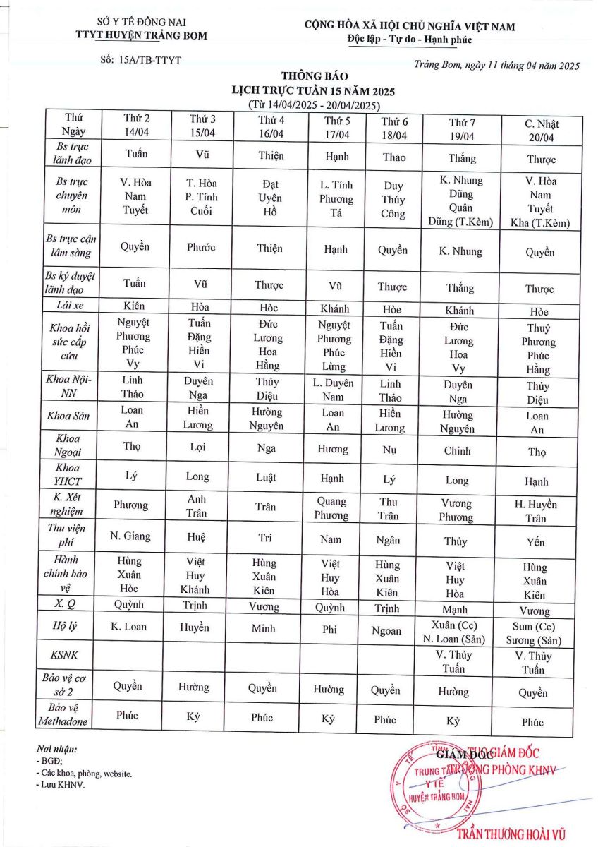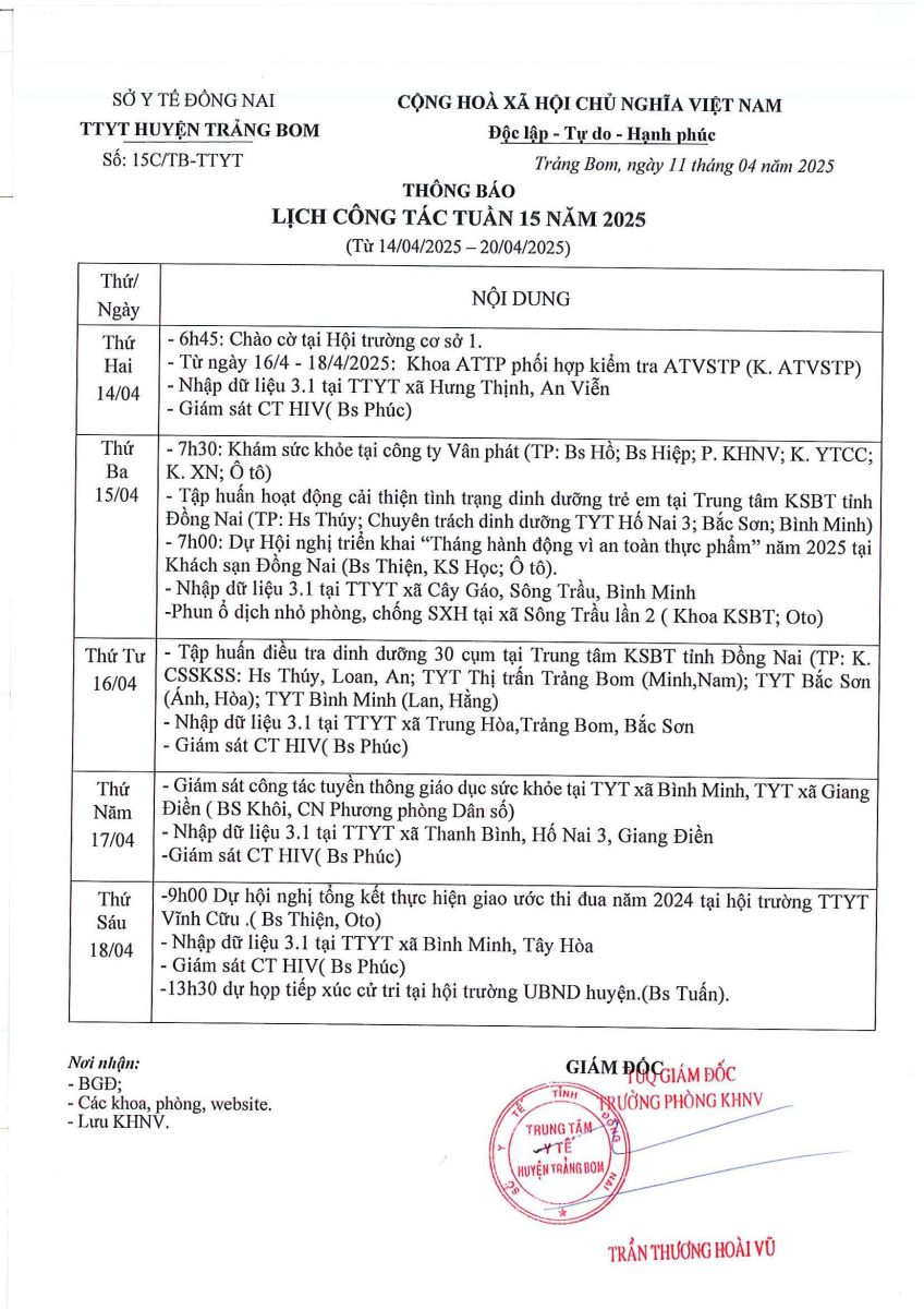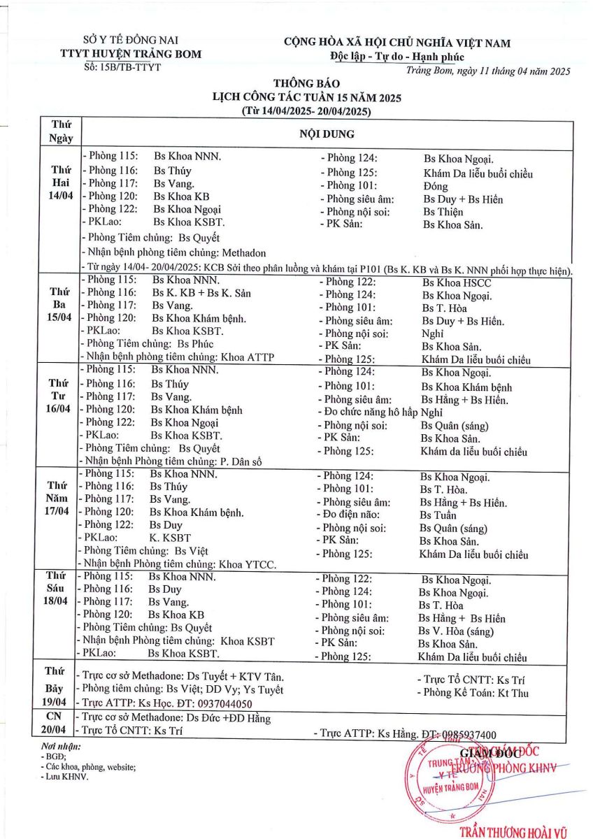 Lịch trực - công tác tuần 16 năm 2025
