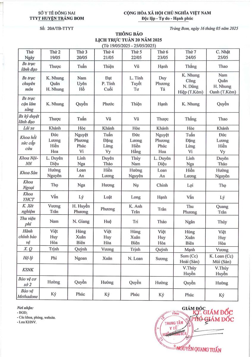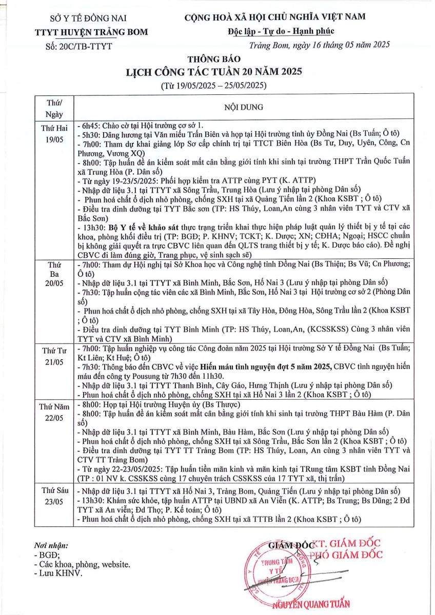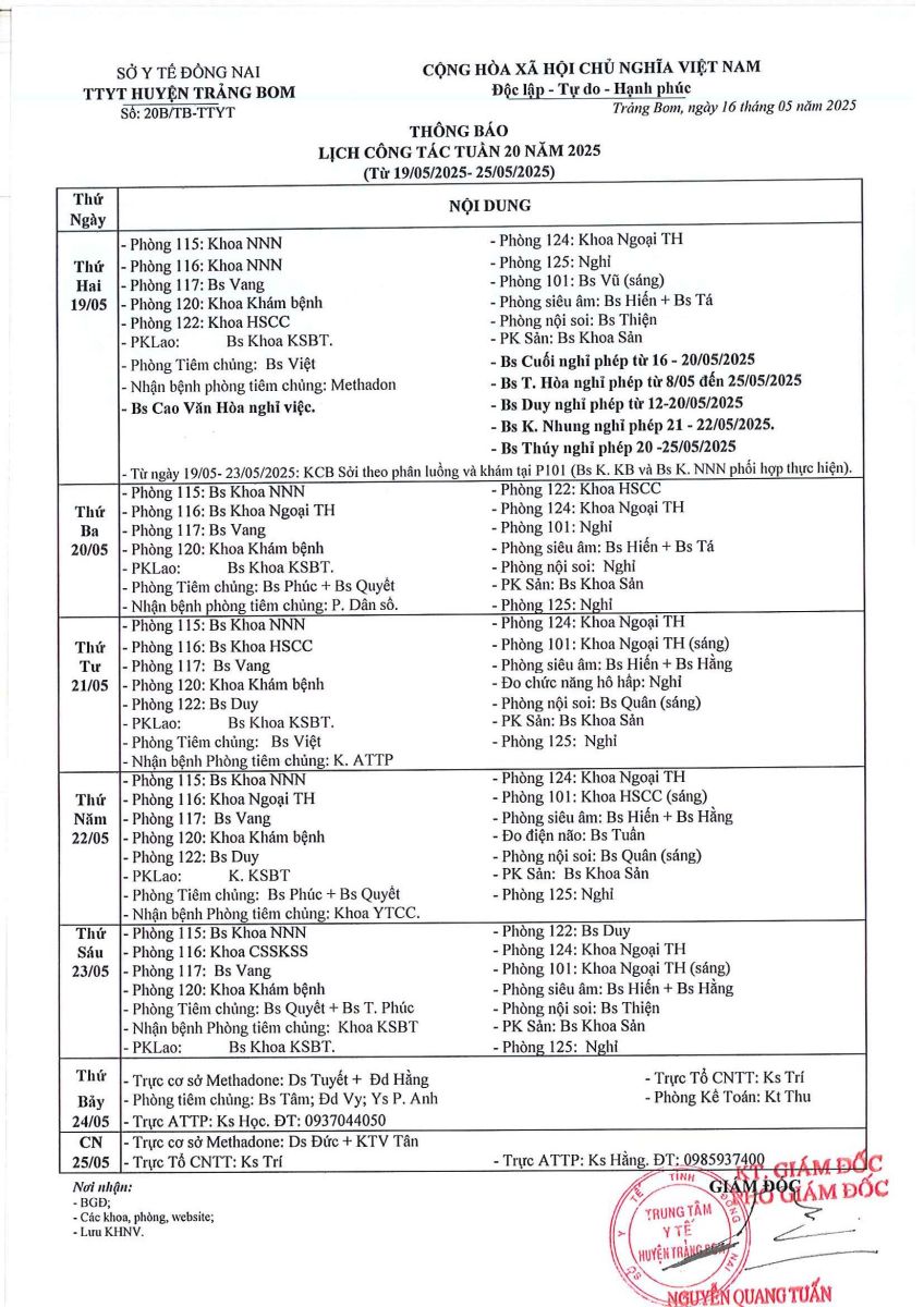 Lịch trực - công tác tuần 20 năm 2025