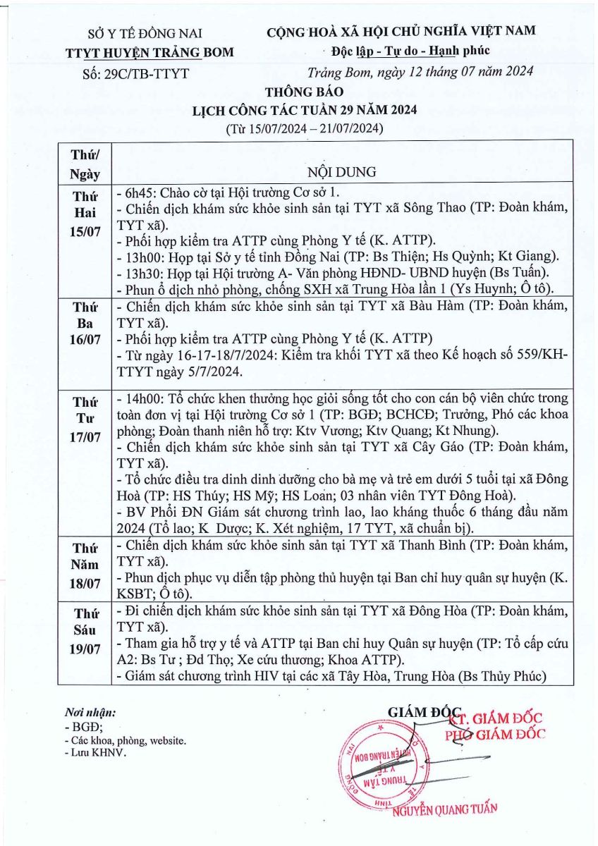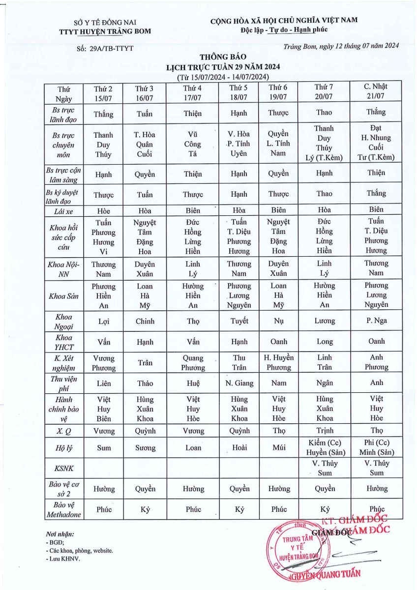 Lịch trực - công tác tuần 29 năm 2024