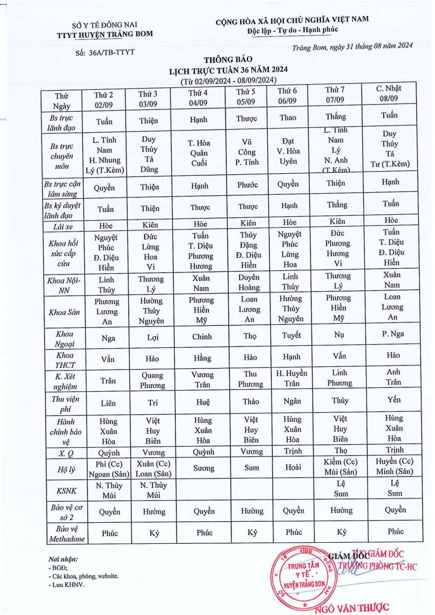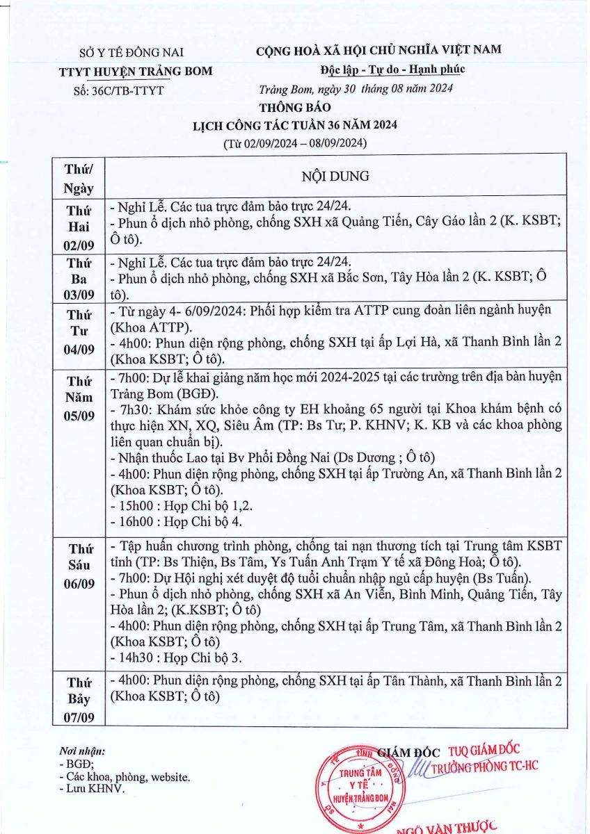 Lịch trực - công tác tuần 36 năm 2024