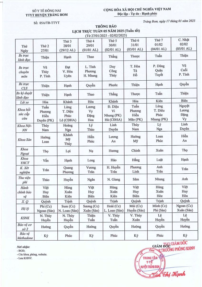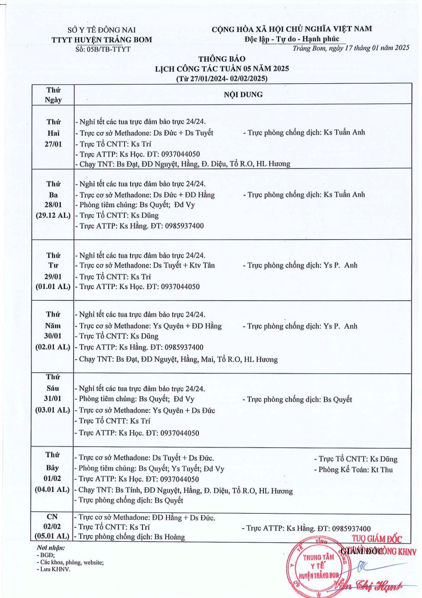 Lịch trực - công tác tuần 5 -Tết Nguyên Đán năm 2025