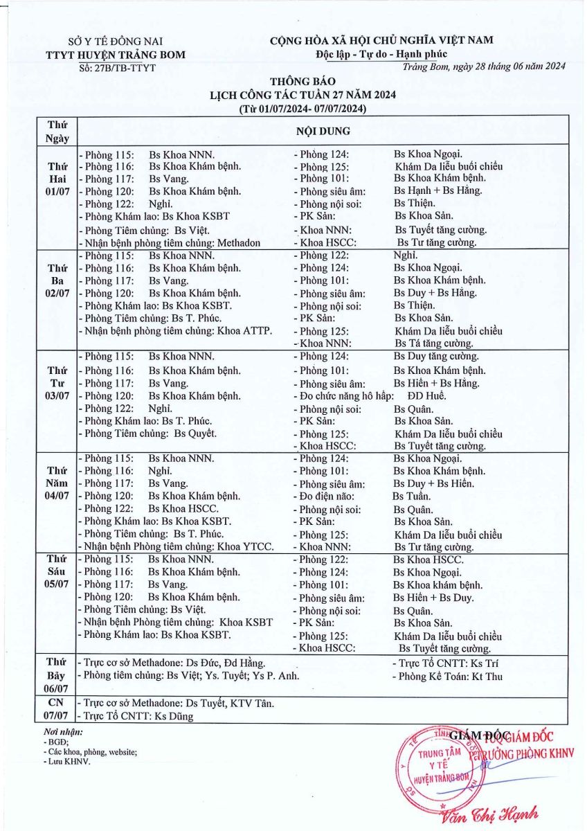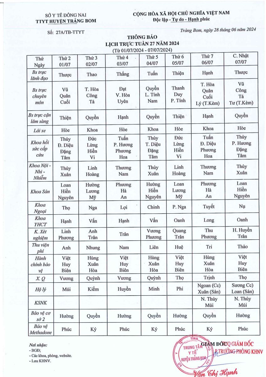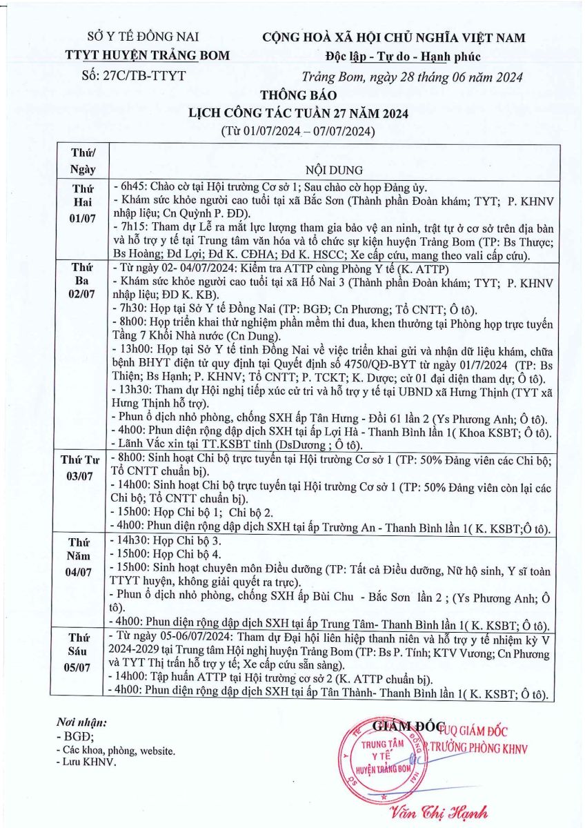 Lịch trực - công tác tuần 27 năm 2024