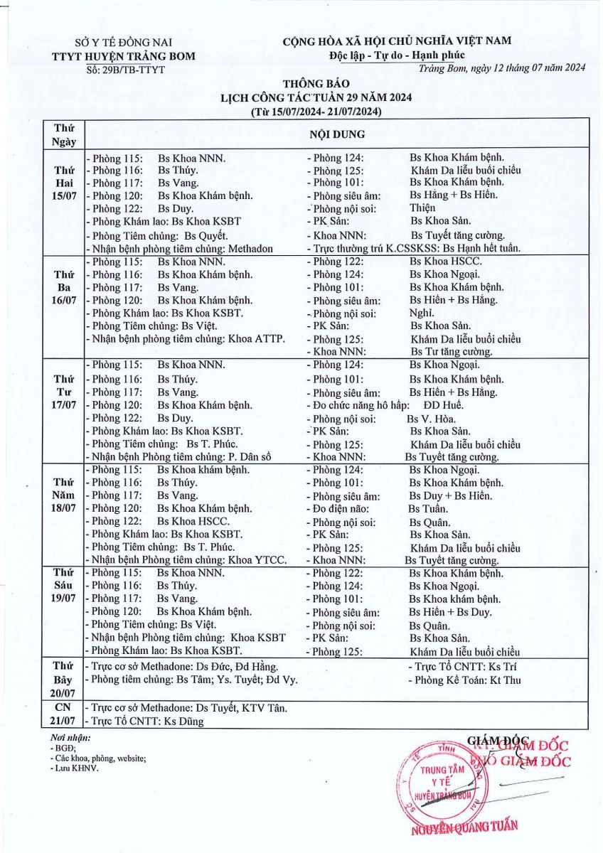 Lịch trực - công tác tuần 29 năm 2024