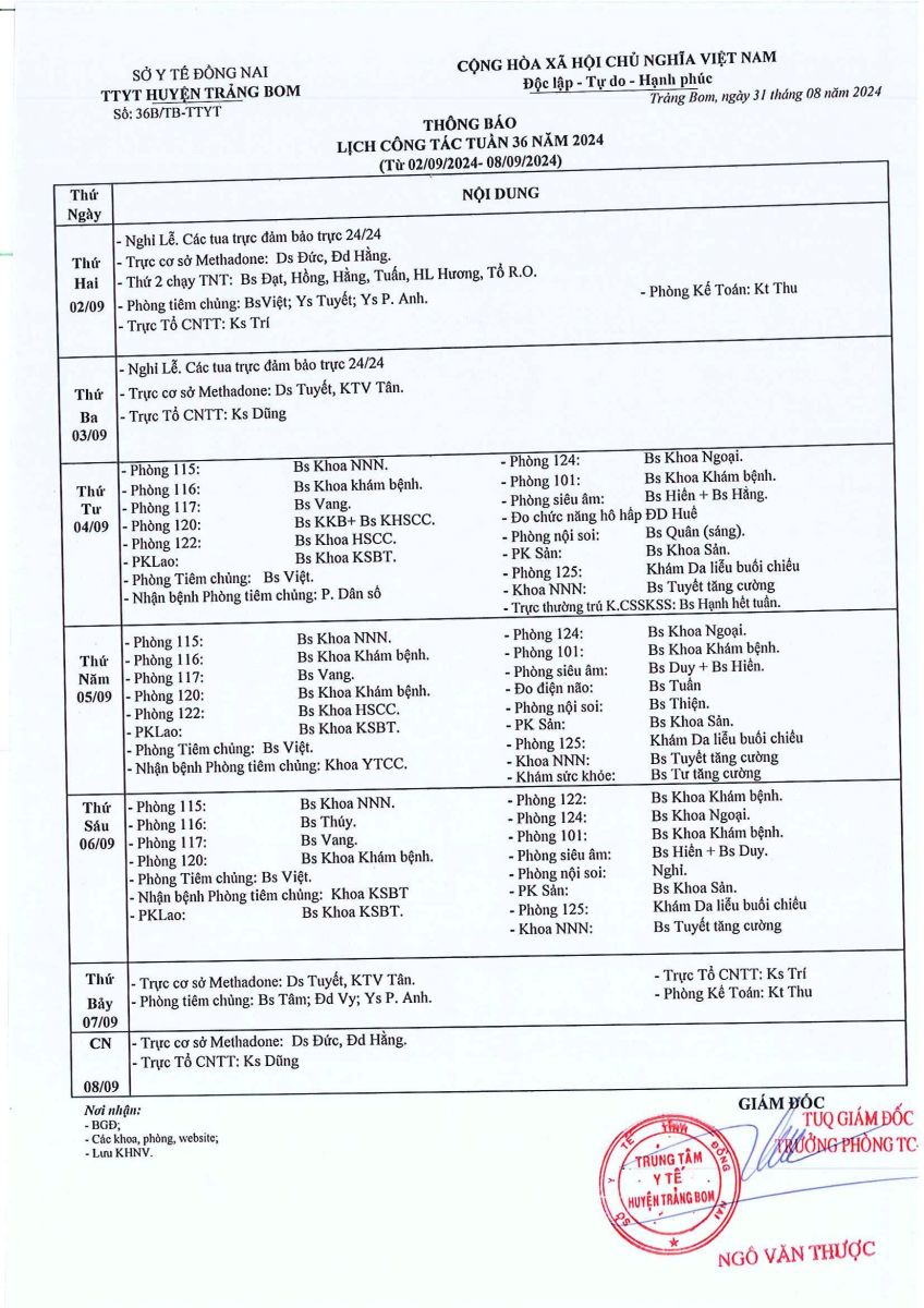 Lịch trực - công tác tuần 36 năm 2024